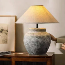 Wabi Sabi Traditional Style Japanese Grey Clay Stone Table Lamp